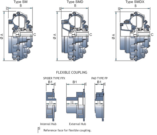 These shaft-mounted fluid couplings are engineered for axially compact drive spaces, featuring a flexible coupling on one end. Available in multiple configurations (SM, SMD, SM-DX), they offer enhanced adaptability for industrial applications ranging from mining to high-power transmission. SM types use rubber couplings, while SMD and SM-DX include delay fill chambers for advanced torque control. Designed to ensure optimal shaft alignment and protection, they also feature thermal safety options and compatibility with a wide range of shaft sizes.